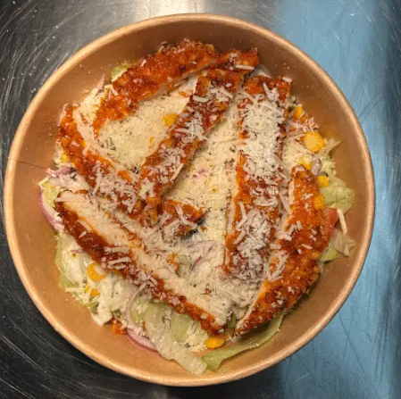 Knackiger Salatmix mit Gurken, Tomaten, Mais, Rotkohl und Karottenstreifen, verfeinert mit cremigem Dressing nach Wahl.