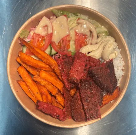Vegane Falafel-Balls aus Rote-Bete, Süßkartoffel, cremiger Hummus, Salatmix und mit Reis oder Quinoa.