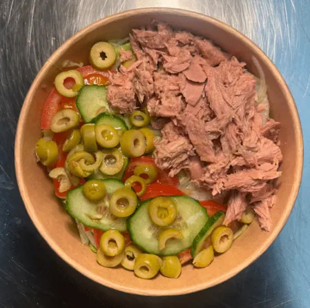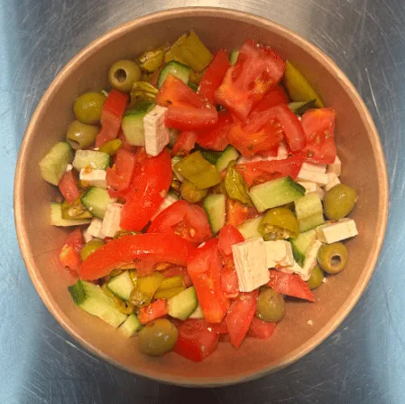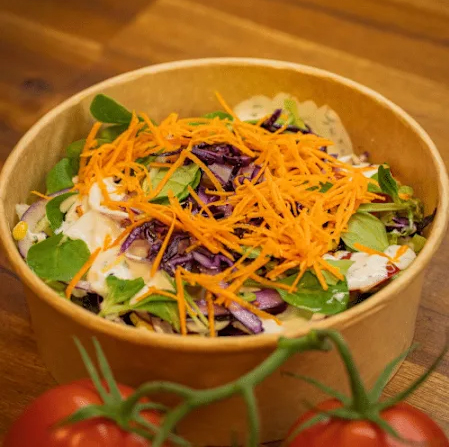 Knackiger Salatmix mit Gurken, Tomaten, Mais, Rotkohl und Karottenstreifen, verfeinert mit cremigem Dressing nach Wahl.