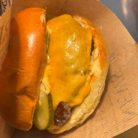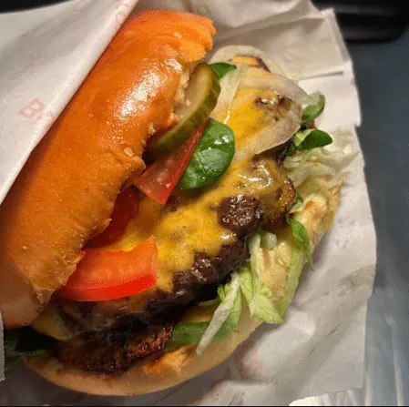 Regionales Rindfleisch auf fluffigem Brioche-Bun, veredelt mit echtem Cheddar, frischem Salat, saftigen Tomaten, knackigen, eingelegten Gurken und unserer Burgersoße.