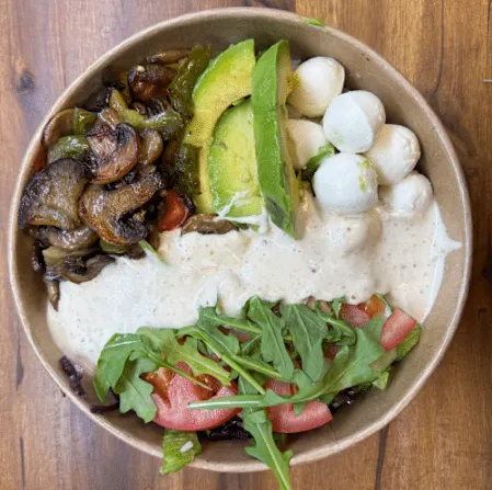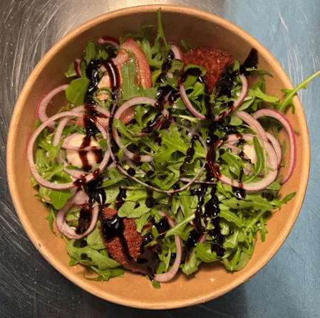 Frischer Rucola mit cremigen Mini-Mozzarella-Bällchen, Tomaten, roten Zwiebeln, Balsamico Creme und gebackenen Falafel für extra Protein & Biss.